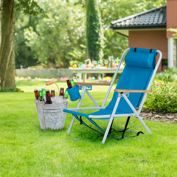 Folding Beach Chair Set Of 2 For Adults, 4 Position Portable Backpack Foldable Camping Chair With Headrest Cup Holder And Wooden Armrests, Blue